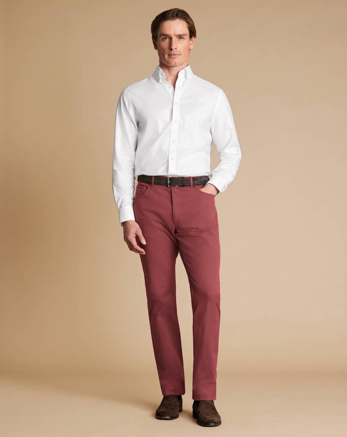 97% cotton, 3% elastane, Available in classic and slim fit, Stretch fabric, Exclusive Charles Tyrwhitt printed lining's, Zip fly with shank metal button closure, Five-pocketing styling and patch pockets on reverse, Belt loops to fit 4.5 cm belt, Machine washable - Twill 5 Pocket Jeans - Claret Pink | Men's Charles Tyrwhitt Twill 5 Pocket Jeans - Claret Pink Red Size W32 L32 Cotton