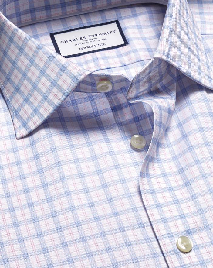 100% 2-ply Egyptian cotton, Available in classic, slim and extra slim fit, Semi-spread collar, Classic and slim fit: back pleats, Extra slim fit: back darts, Rounded single cuff with two buttons, Machine washable - Luxury Check Shirt - Pink & Sky | Men's Charles Tyrwhitt Luxury Checkered Dress Shirt - Pink & Sky Single Cuff Size 15.5/33 Cotton