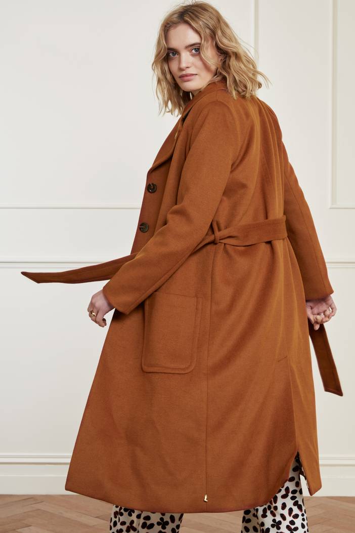 Classic long coat with two generous patch pockets and a gold-coloured brooch on the left collar. Natalia Coat has beautiful brown buttons and a tie belt. This item is made from recycled plastic bottles (rPet): supple, comfortable and easy to care for. Discover how many bottles are recycled to make your garment inside the care label. The inner lining of the coat is also made of 100% recycled polyester and has a Dalmatian print.