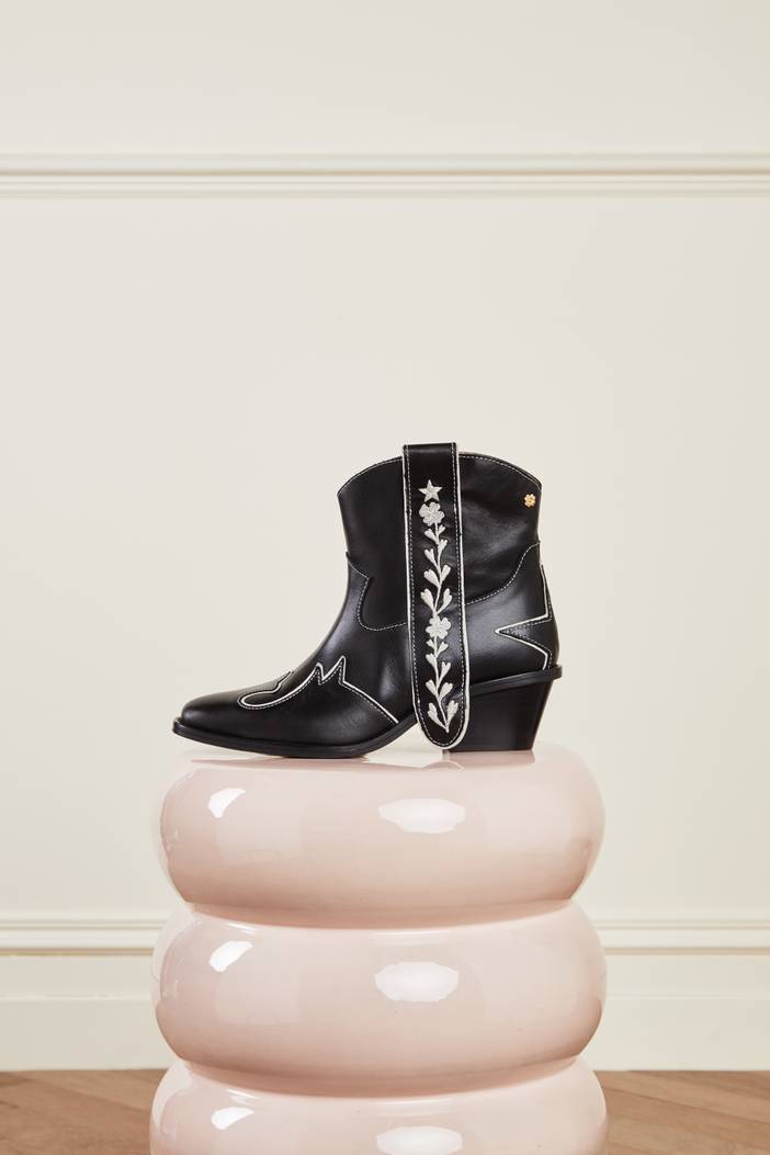 Leather cowboy boot with a zipper and square toe. Jolly Zipper Embroidery Boot has a low, sturdy heel and stitched details.