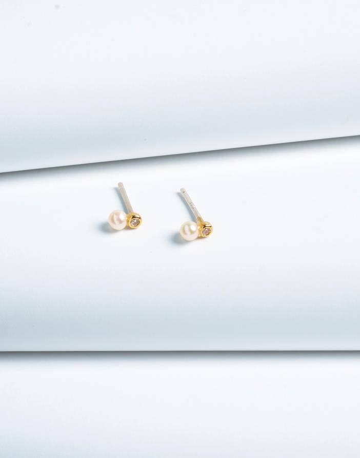 Crafted from 14k gold over sterling silver, our Demi-Fine pieces are future keepsakes meant to be layered and worn every single day (think of them as your jewelry BFFs). These dainty, bezel-set earrings are hung with real freshwater pearls.3 mm x 6 mm.55% freshwater pearl, 20% recycled brass, 20% cubic zirconia, 5% sterling silver.Sterling silver posts are naturally soft due to the high silver content (just bend 'em back into shape if they get out of whack).Nickel-safe.Clean your jewelry after each wearing with a soft cloth.Imported.