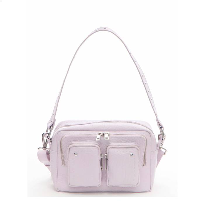 Ellie has a large compartment that closes with a zipper. The bag has a smaller compartment and two small pockets on the front. The bag has a shoulder strap and adjustable strap which can be removed.