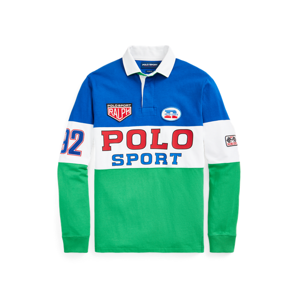 Dieses Unisex-Rugbyhemd aus Baumwolljersey greift mit Aufnähern und Drucken im Rennsport-Stil das Motocross-Thema der Saison auf.