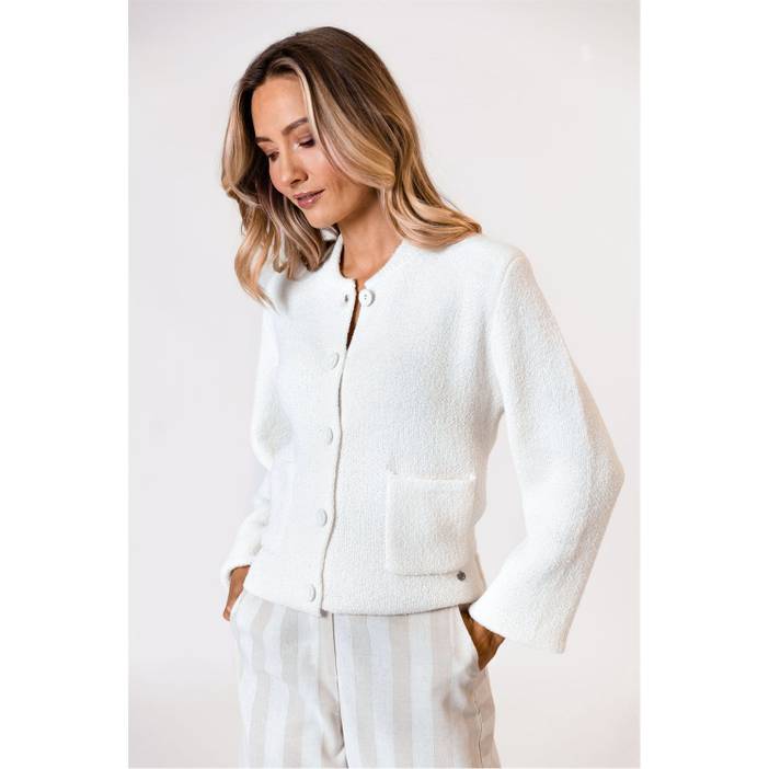 Add a touch of style and comfort to your wardrobe with this beautiful bomber cardigan. The cardigan is made of soft bouclé yarn, has a cropped length, elastic waist and light shoulder padding for a flattering and contemporary silhouette.