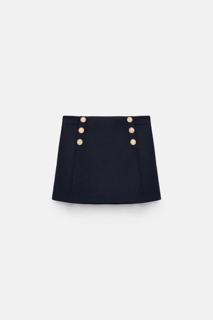 The bonded wool flannel mini skirt has a decorative front panel with gold-tone buttons. The thigh-grazing style has an in-seam side zip closure.