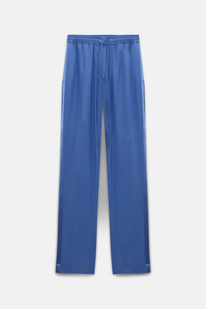 The silk-satin wide leg pants have a relaxed fit and drawstring waist.