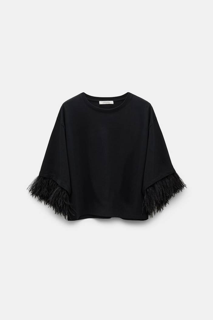 The boxy cotton T-shirt is crafted in heavy weight single jersey and features half sleeves with removable ostrich feather trim.