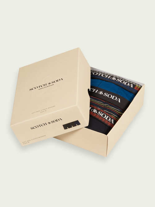 Our boxers come in a giftbox with an assortment of three boxer briefs, all featuring print accents and the Scotch & Soda logo on the waistband. Made with a hint of elastane, these boxers give all-day support and comfort.