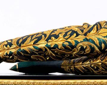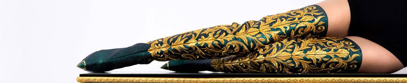 Ishida’s superlative craftsmanship is matched by his use of the finest materials: embroidered, custom-dyed and hand painted python which is polished using natural stones, patent leather, buttery suede and sumptuous velvets come in a custom palette of golds, greens, blues and reds.
