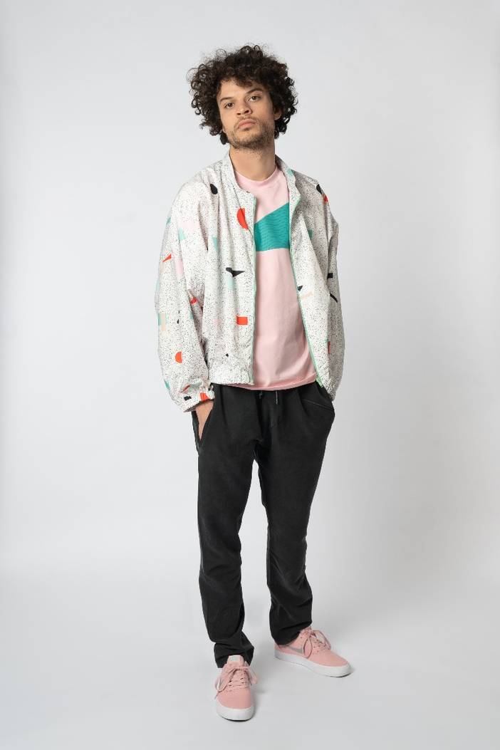 Short jacket with bomber neck made of the same fabric as the rest of the jacket. It has side pockets on both sides and also one inside pocket. It's made of a sustainable circular fabric which is made of bottles. The fabric is breathable and soft. The print is an original "Terror Kittens" print with different colours. It has geometric shapes and small black dots on white basis. The jacket has a minth coloured zipper. The model is 180 cm long and wears size M.