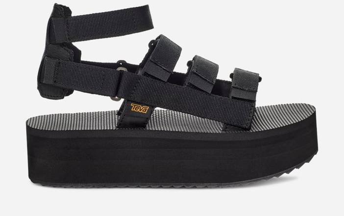 Deze sandaal is een moderne variant op de traditionele gladiatorensandaal en tilt de Flatform naar een hoger niveau. De Flatform Mevia heeft een nieuw ontworpen bovenstuk met zachte bandjes gemaakt van gerecycled plastic en meerdere verstelpunten voor de perfecte pasvorm. | Teva Flatform Mevia Sandalen in Black voor Dames, Maat 36