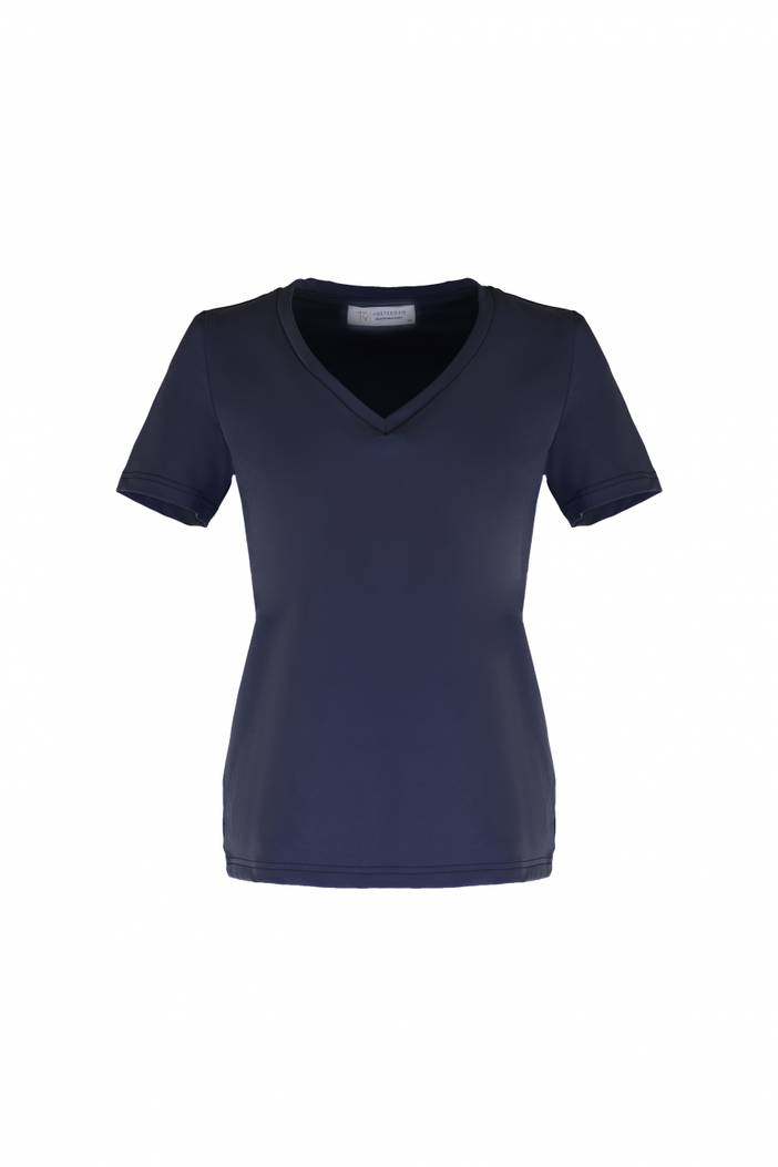 Een comfortabel basis T-shirt met V-hals en korte mouw. De top is gemaakt van travel stof bestaande uit polyamide en elastaan, wat zorgt voor een fijn draagcomfort.