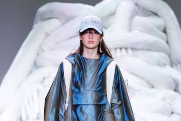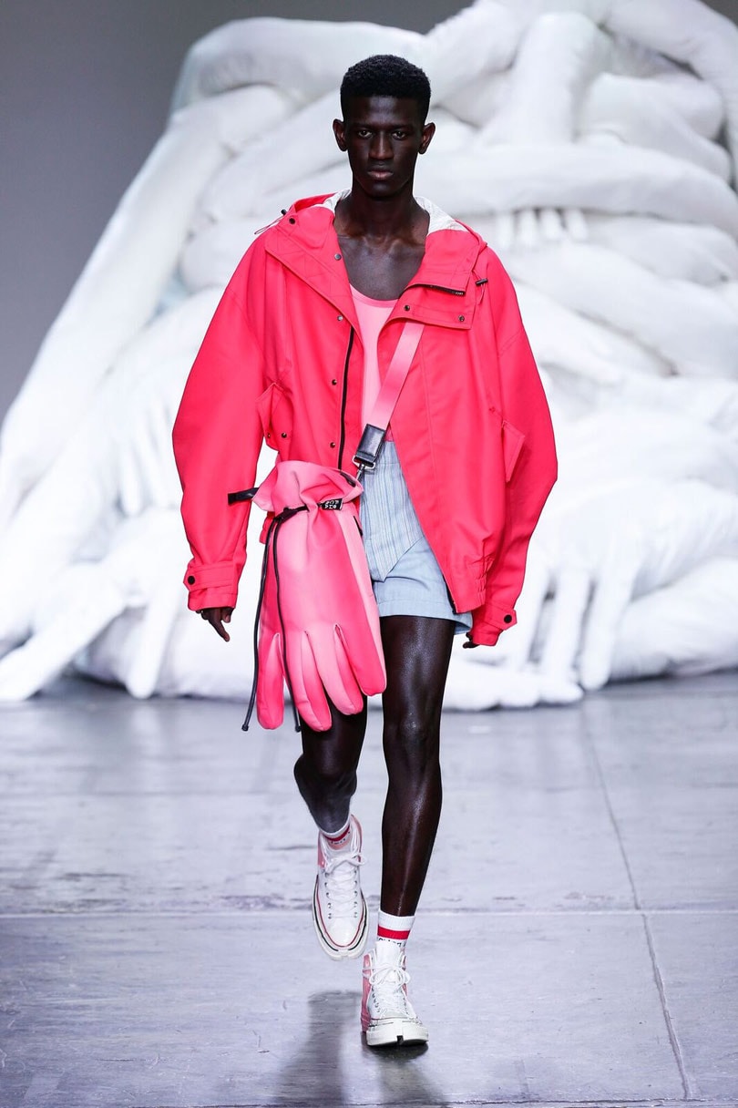 At the center of her runway was a sculpture made of oversized gloves. Though it might seem like a modern art addition, hands and touch symbolize human connectivity, so it was sensibly on theme. The collection also featured backpacks and handbags in the shape of giant gloves.