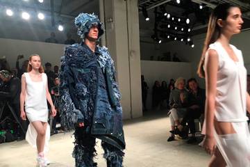 Shizhe He is interested in the mundane, the everyday, and the routine, and her attempts to subtly disrupt these elements formed the basis of her layered menswear collection. Her love of fine arts and devotion to patternmaking married wonderfully in a slouchy suit topped with overcoat in a shade of cornflower blue straight out of a Johannes Vermeer work.