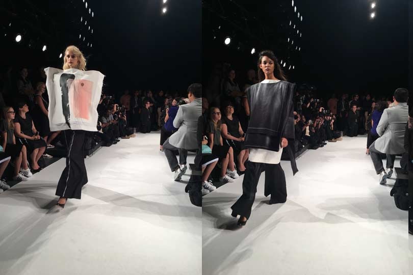 New York’s Fashion Institute of Technology presented Alyssa Wardrop whose artful creations proved to be the most avant-garde of the evening. She hand painted and stitched onto large-scale squares like an artist approaching a canvas. Despite this potentially cumbersome shape, the garments wafted. Oversized twill tunics with dropped shoulders and top stitching, and dresses with arm straps outlined in graphic black evoked Rothko in their controlled placement of color always anchored by a white ground.