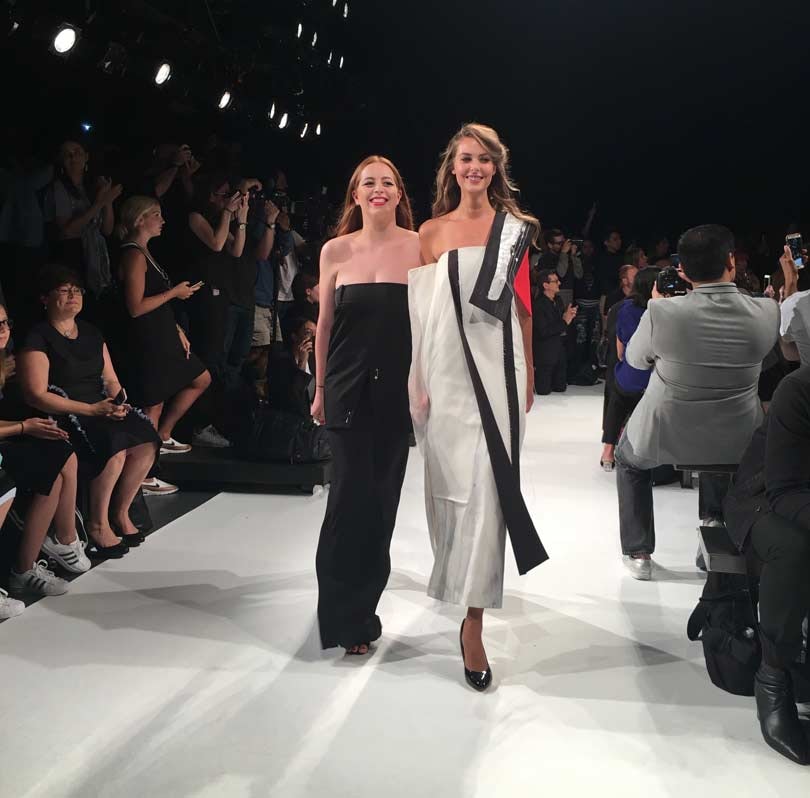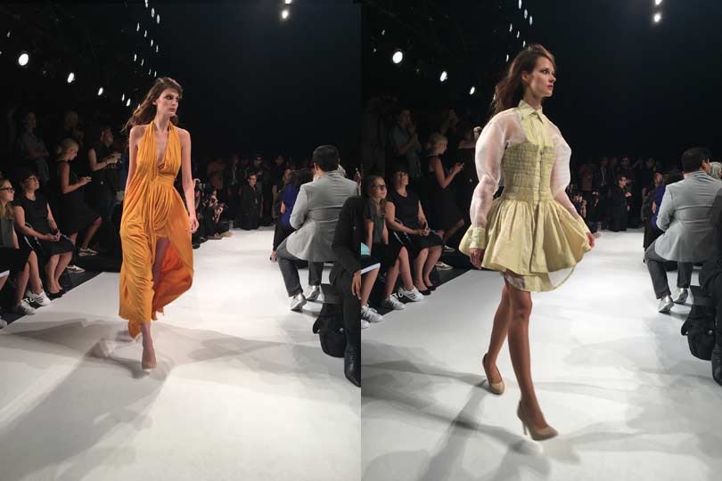 With parents who are engineers, it’s perhaps to be expected that Sarah Johnson from Kent State University cites the importance of attention to detail in her work which featured an abundance of handcraft. A knit draped halter dress in liquidy saffron demonstrated a sophisticated taste level while extensive cartridge pleating suspended on rope and widelegged pants with double pockets and an obi-like belt added exoticism.