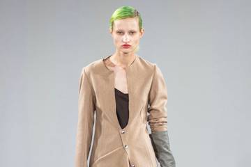 Under the title ‘Here just to scream’, graduate Yuliya Hlazun invited the audience on a journey into the future. Oversized, extraterrestrial-looking sequins are paired with elaborately draped silhouettes, garish wigs and many a bare leg.