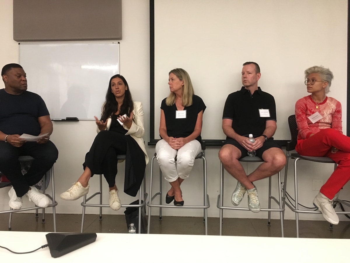 The audience is filled with Middle America’s Gen Z––junior level fashion students embarked on a study away semester, on location from Ohio’s main campus. The participants of this panel personify the culture shocks these young people might be presented with in New York City when weighed against the values they have perhaps been brought up with in their communities.