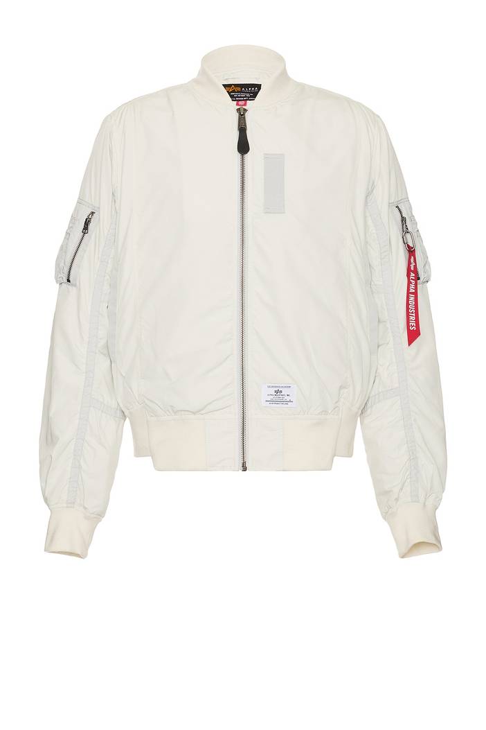 ALPHA INDUSTRIES JACKE in Dune White - White. Size L (also in M, XL/1X). 100% Baumwolle. Hergestellt in Kolumbien. Maschinenwäsche. Reißverschluss vorn. Seitennahttaschen. Utility zipper pocket at sleeve4 micro slip pockets at utility sleeve. Ripstop fabric with knit trim. About the designer: