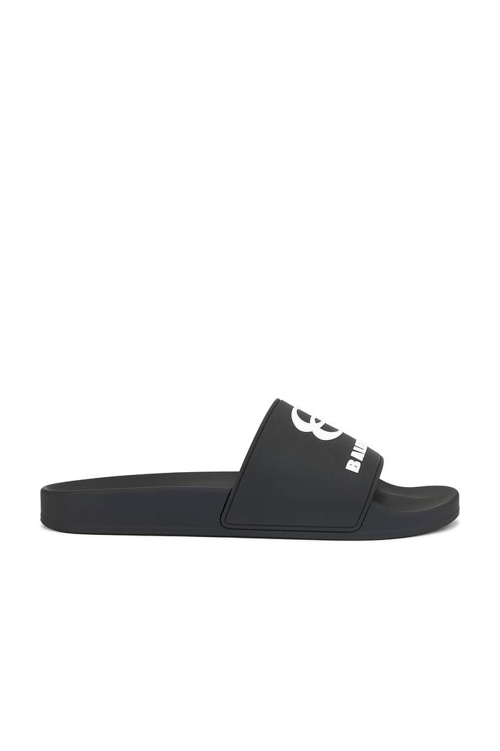 Balenciaga BADESANDALEN BAL LOGO in Schwarz & Weiß - Black. Size 40 (also in 41, 42, 43, 44). Obermaterial und Laufsohle Gummi. Hergestellt in Italien. Schlupfform. Rubberized logo on top. About the designer: Creative director since 2015, Demna Gvasalia continues Balenciaga’s tradition of extreme experimentation, bringing his uniquely subversive vision to the storied French house. Merging the worlds of streetwear and high fashion, and blatantly disregarding industry conventions, Gvasalia reconfigures the label’s archival pieces with signature exaggerated silhouettes, asymmetric cuts, and acid colorways. Androgynous blazers, trench coats, and wool overcoats are cut in oversized shapes, while t-shirts, hoodies, and knitwear feature signature logo graphics.