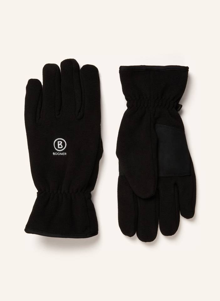 . Fingerhandschuhe. Aus Fleece und Leder. Handflächen aus Veloursleder-Besatz. Kleine Lederschlaufe mit Karabinerhaken seitlich. Ungefüttert. Logo-Stiching auf der Vorderseite