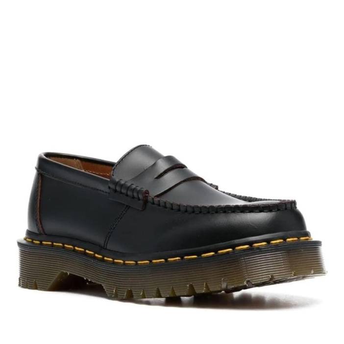 The Dr. Martens Penton Bex Made In England Loafers are premium footwear crafted for women, offering a striking blend of classic and edgy style. Featuring a sleek black finish, these loafers are adorned with a prominent penny strap and visible contrast stitching. The standout chunky, ridged sole with yellow welt stitching adds a distinctive touch, while the translucent quality of the sole offers a modern twist to its timeless silhouette.
