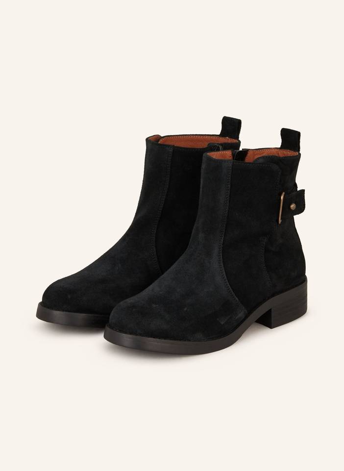 . Veloursleder. Goldfarbene Metalldetails. Ziernähte. Zuglasche am Schaft. Seitlicher Reißverschluss. Riegel mit Dornschließen. Mandelförmige Vorderkappe. Blockabsatz in Schichtholz-Optik. Rutschhemmende Laufsohle. Label-Prägung an der Hinterkappe