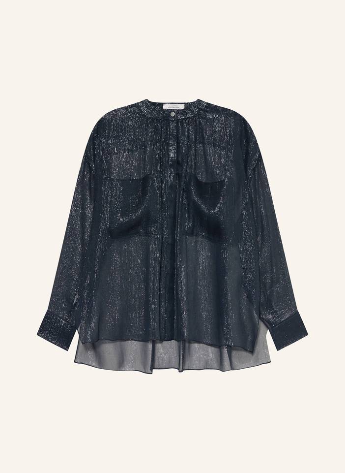 . Gerader Schnitt. Geknöpfter Rundhalsausschnitt. Schließt mit durchgehender, verdeckter Knopfleiste. Schmale Rückenpasse. Quetschfalte. Aufgesetzte Brusttaschen. Einknopf-Manschette. Glitzergarn allover. Raffung am Kragen und Rücken. Verlängerte Rückenpartie. Seitenschlitze. Transparente Qualität. Feine Haptik. Aus Seide