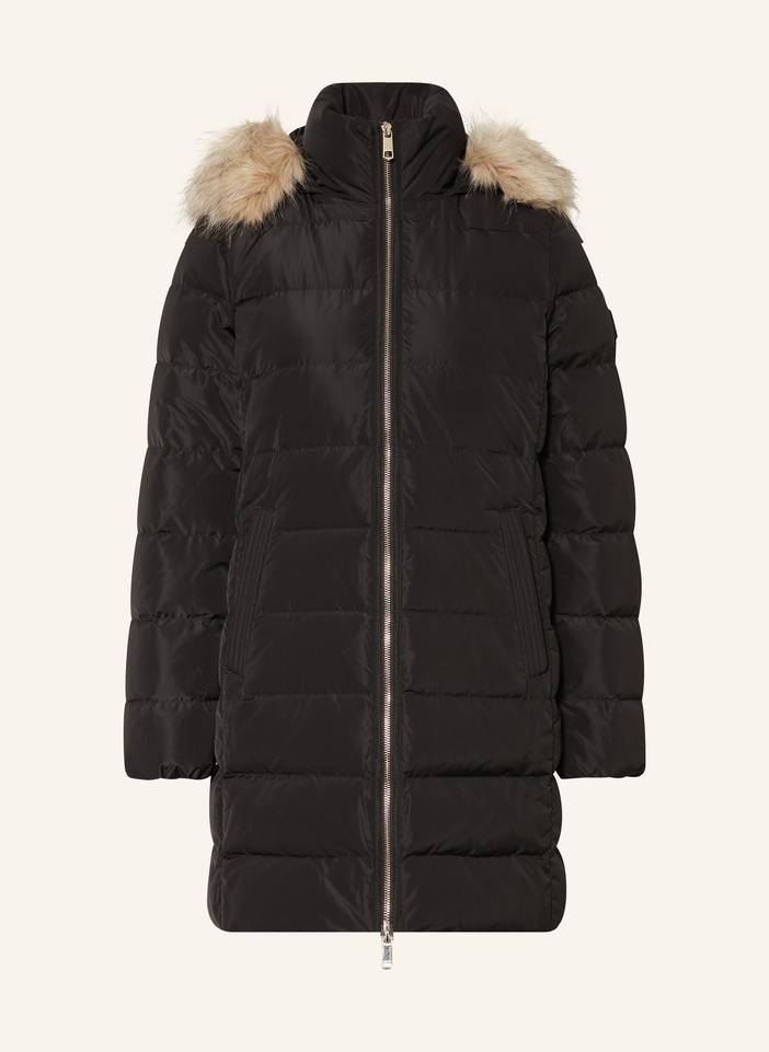 . Taillierter Schnitt. Kapuzenkragen mit Tunnelzug. Abnehmbarer Kunstpelz. Schließt mit unterlegtem Zwei-Wege-Reißverschluss. Leistentaschen mit Reißverschluss vorne. Elastische Nähte an den Ärmelenden. Gestepptes Innenfutter. Füllung aus Daunen und Federn. Wasserabweisend. Label-Badge am Ärmel. Gestepptes Design