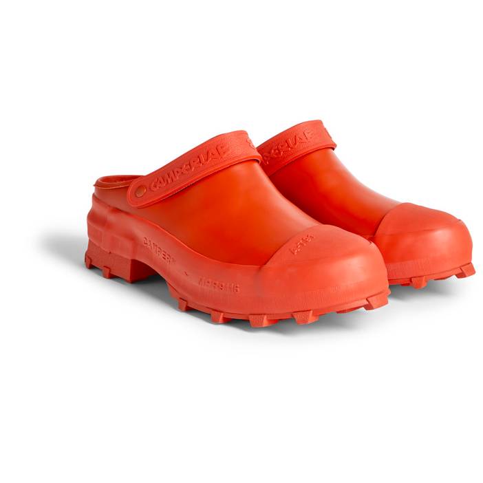 Camper Vulcanized red leather clogs with an ankle strap and toothed rubber outsole. Upper Calfskin / PU / Rubber Color Red Outsole/Features Rubber Insole OrthoLite® Lining 65% Calfskin, 35% Textile (45% recycled Polyester - 35% Cotton - 20% Viscose) Leather Working Group Certified