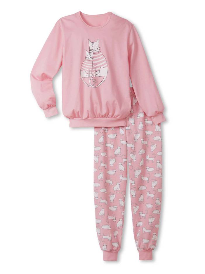 Kinder-Bündchen-Pyjama von CALIDA aus der KIDS CAT Serie in sanften Blushtönen mit Katzen-Allover und Katzenmotivdruck. Dank des süssen Designs und der kuscheligen Single Jersey-Qualität aus 100% Bio-Baumwolle gehen kleine Schmusekätzchen sicher liebend gerne ins Bett.