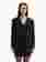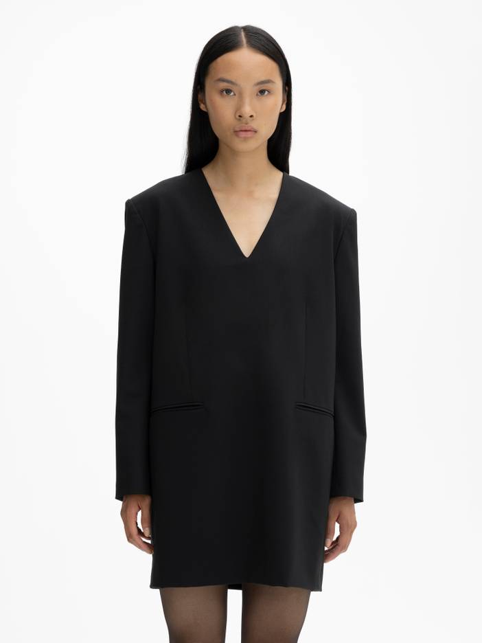 Tailored shift dress made from lightweight wool suiting with a deep v-neckline, front besom pockets, structured shoulder pads, and back pleats, rendering a rounded effect.
