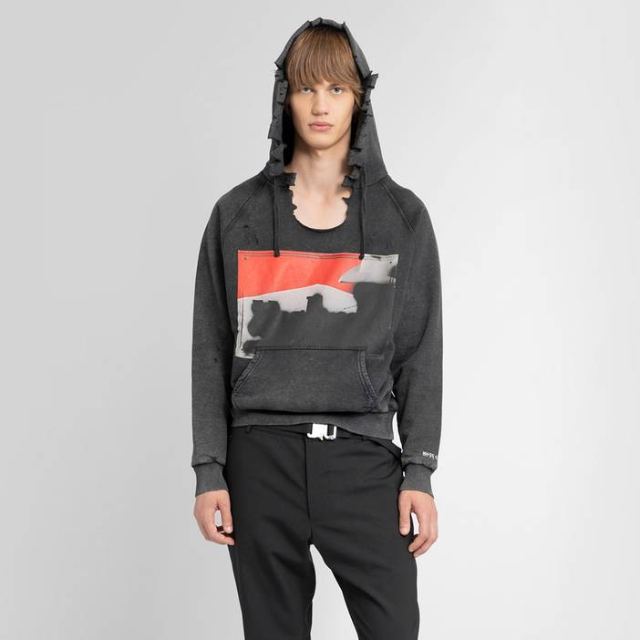 1017 alyx 9sm men's washed black destroyed mark flood box hoodie - washed black - destroyed details - fixed hood - front printed graphic patch - kangaroo pocket - sleeve mark flood logo print - ribbed hem and cuffs - 100% cotton - made in Italy