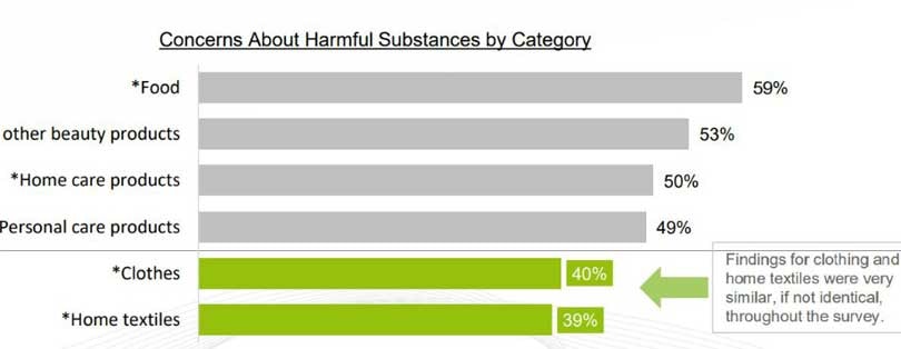 What the researchers found surprising, however, is that a higher percentage of consumers than thought – 4 in 10 people – are concerned about harmful substances in clothing or home textiles. In fact, there is only a 20 point difference between concerns about harmful substances in food (where the consumer sustainability movement started) and in clothing: the gap appears to be closing. For the researchers, this is an indicator that impressions of the textile industry might be changing.