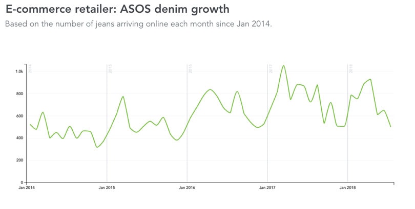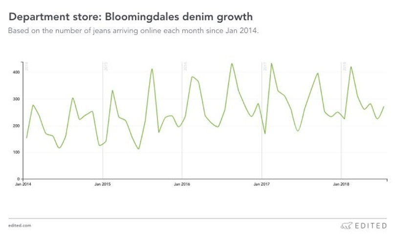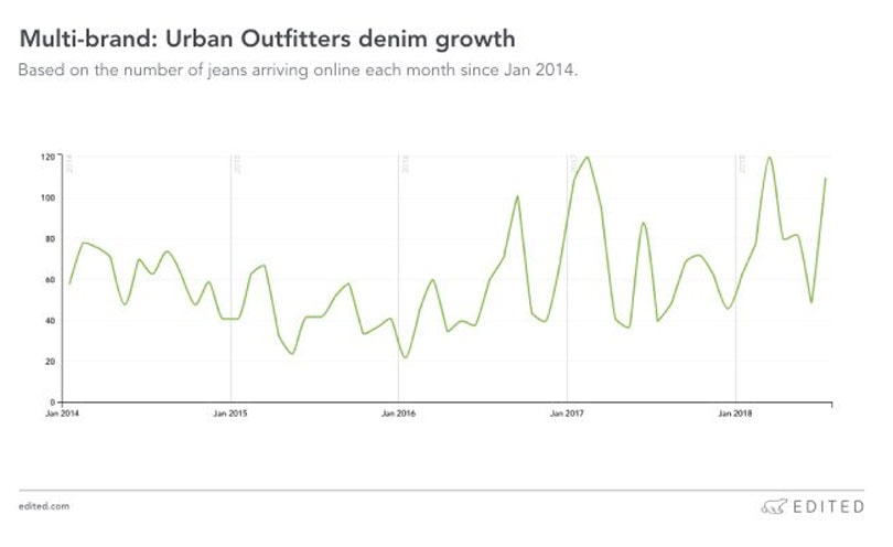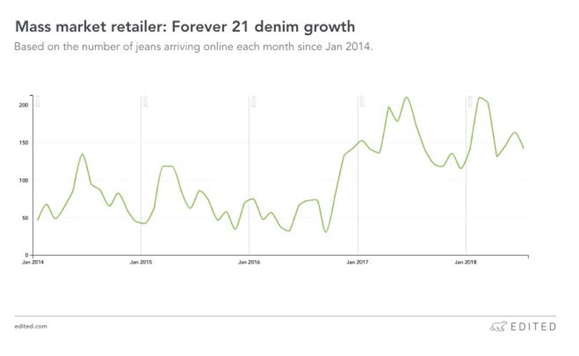 While most retailers have indeed dropped their denim offering between 2015 and 2016, the category has seen a boost in the last 18 months. According to Edited, there is 42 percent more product in stock this quarter, compared to the same period last year. Forever 21, for example, added 120 new jeans to its catalog in February 2018 -- the highest number in four years.