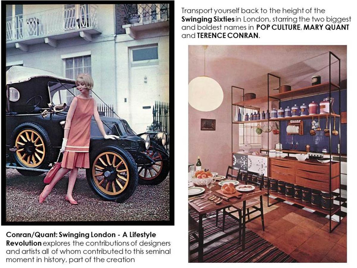 The accompanying book pays homage to the Chelsea Set, a progressive clique dedicated to Bohemian lifestyle that was to change the course of the contemporary design of the 1960s. In addition to Quant's husband Plunket Greene and Conran's wife Shirley Conran, the group also included designers Bernard and Laura Ashley, sculptor Eduardo Paolozzi and artist and photographer Nigel Henderson. The book tells the story of an era through a mix of biography, fashion photography and vintage advertising. It transports the reader back to London at the height of the Swinging Sixties and shows Quant and Conran as friends, colleagues and allies at the helm of this informal, influential group that steered the rudder of British style during the pop era.