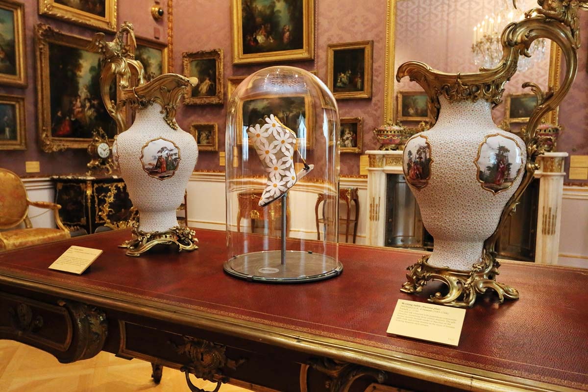 In the Wallace Collection’s Boudoir Cabinet, Blahnik’s carefully worked, jewel-encrusted shoes are reflected amongst the diamond-mounted gold boxes and delicately painted miniatures, while in the West Room the collection highlights the “best of Britain” as seen through Blahnik’s eyes with shoes featuring natural motifs and plaid, alongside the portraits by British masters such as Reynolds, Gainsborough and Landseer.