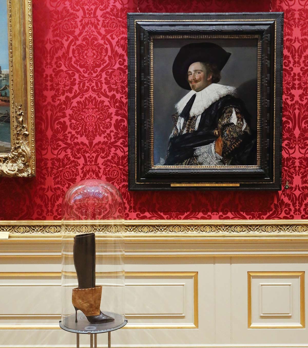 The exhibition culminates in the Great Gallery, which houses a selection of masterpieces, including works by Rubens, Titian, Velázquez, and Frans Hals’s 1624 portrait of The Laughing Cavalier which is juxtaposed alongside a pair of ornate knee-high boots.