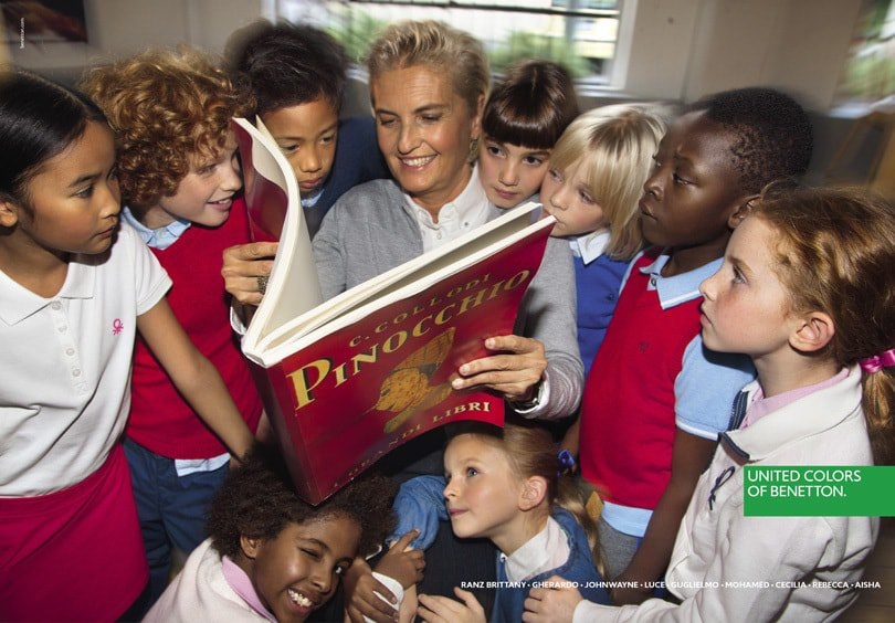 The new Benetton campaign shot by Toscani renews a recurrent theme - integration - one which the brand stand firmly behind. The campaign depicts a racially diverse Italian classroom of twenty-eight children from thirteen different nationalities from four continents, smiling and learning together. In one photograph, ten children, from countries such as the Philippines, Italy, and Senegal, all gathered around their teacher who is reading to them and smiling because ‘they have a future.’