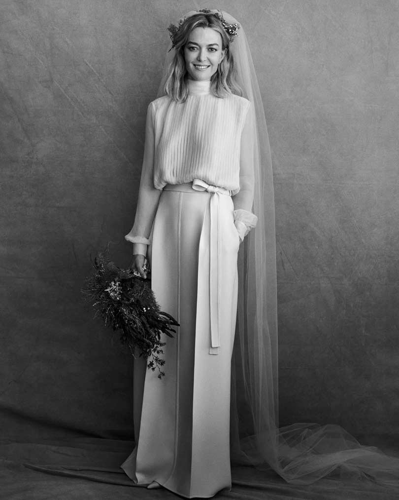 The bespoke gown was designed with simple pleats from the bodice to the neck, sheer sleeves and a full-length skirt. The style was very in par with the contemporary looks offered at Zara, where Ortega serves as a senior creative consultant. Ortega paired her gown with a floral headband and a floor-length veil, making for an understated yet stunning look.