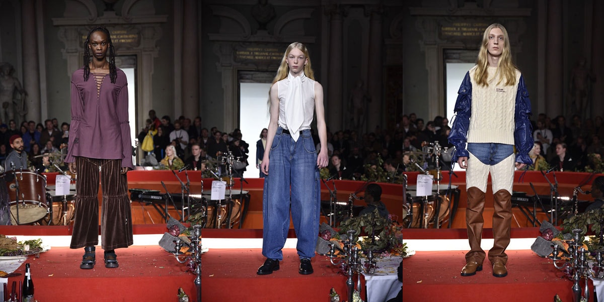 For his AW20 collection, the New York-born designer combined baroque ornament and silhouette with humble material and form. The cast entered into the great hall of the palace, stepping onto and making their way around a giant, circular dining table upon which the remnants of a Baroque banquet were strewn, before making their way through the grand halls of the expansive building.