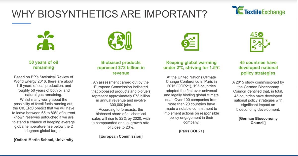 Biosynthetics currently available are PET (Polyester), PLA (Polylactic acid), PTT, PAII (Polyamide), and companies which are investing in this space include Dupont, Arkema, Torey, Ingeo, Fulgar, Natural Fiber Welding.