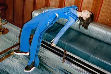 The Blue Version is a modern take on the classic look. The collection includes a sequined track top, shorts, and bodysuits as well as a biker jacket. The recognizable bluebird is used in combination with shades of red, black, and white.