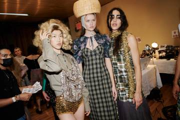 “How has the pandemic affected us mentally— are we still haunted by it?” read the show notes for the collection which, although inspired by the roaring twenties, maintained the art world sensibility of co-founder Carly Mark whose drop waist silhouettes were not paired with flapper purses of beaded fringe but totes made of gold Christmas tinsel. China saucers were stuck to models’ behinds and an oversized Emmental adorned heads. The feeling was a melancholic celebration. “We are teetering the line between hauntedness and hopefulness.”