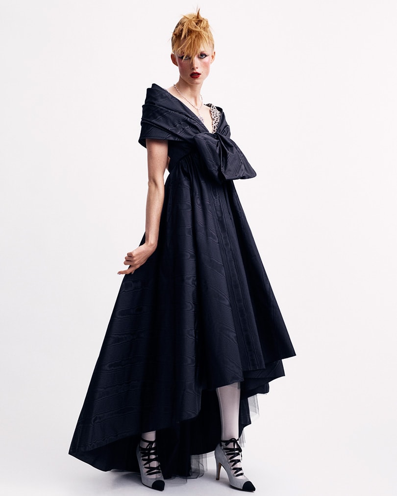 Highlights included tweeds made of silver streaked ribbon, a black jumpsuit with side cutouts, a jacket with an entirely smocked waist worn over tapered boot-trousers in black suede, a tweed dress embellished with flowers, and a black debutant ballgown with a tiered skirt and jewelled top, styled with Marie-Antoinette laced-up shoes.