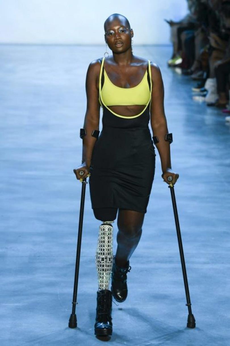 This season, the athletic wear brand’s exuberant show also featured women in hijabs, breast cancer survivor Ericka Hart, who bared her double mastectomy scars to the cheering crowd, and Mama Cax (making her NYFW debut) - who wowed in a yellow and black swimsuit while wearing elegant white knitwear over her prosthetic leg.