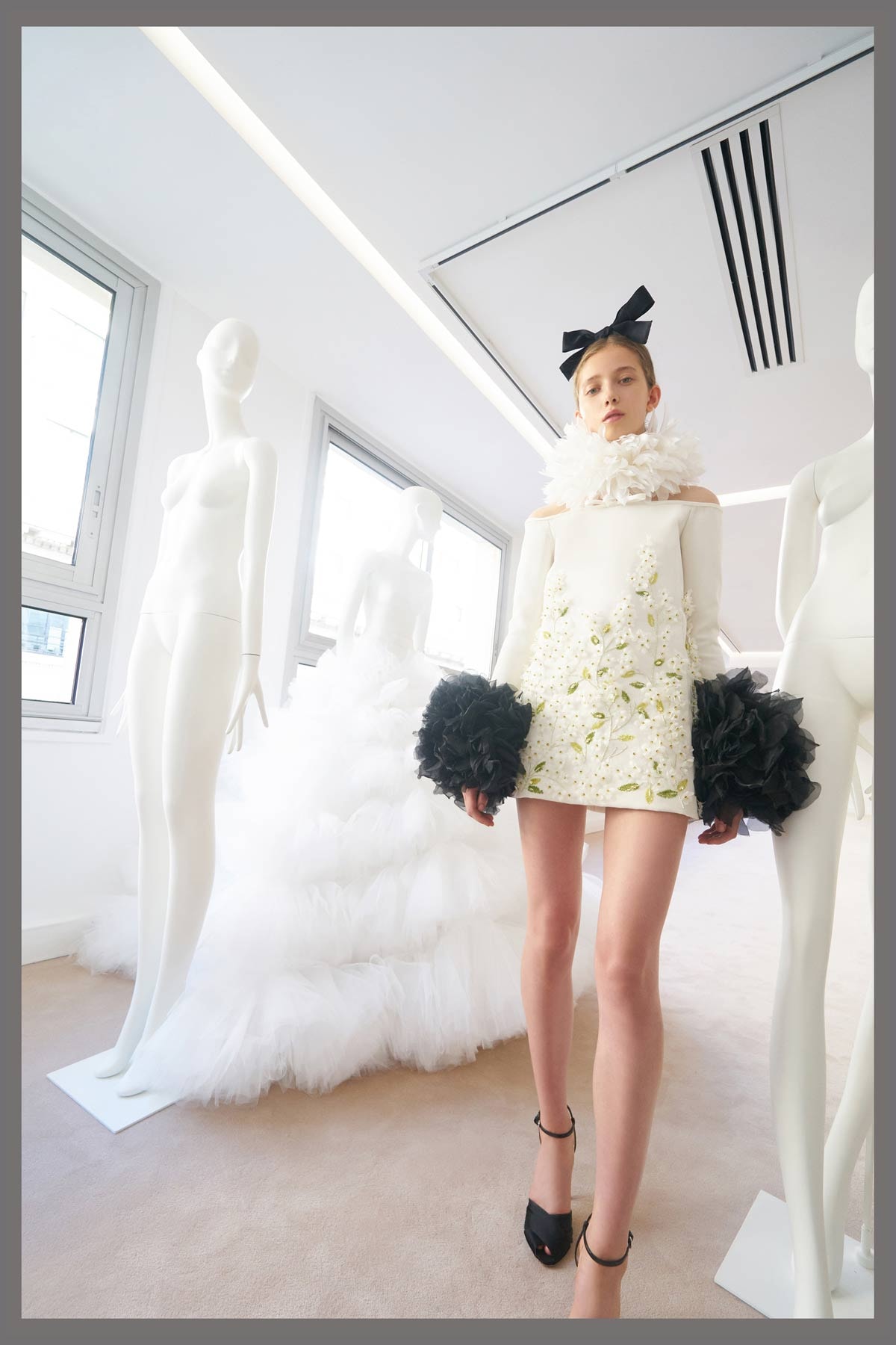 On his Instagram, Valli explained that the exhibition was the “essence of haute couture” allowing guests a closer look at his spectacular made-to-measure creations, from his signature tulle ruffle explosion gowns to bustier cocktail dresses embroidered with silk organza petals and silk taffeta column dresses with all-over floral prints.