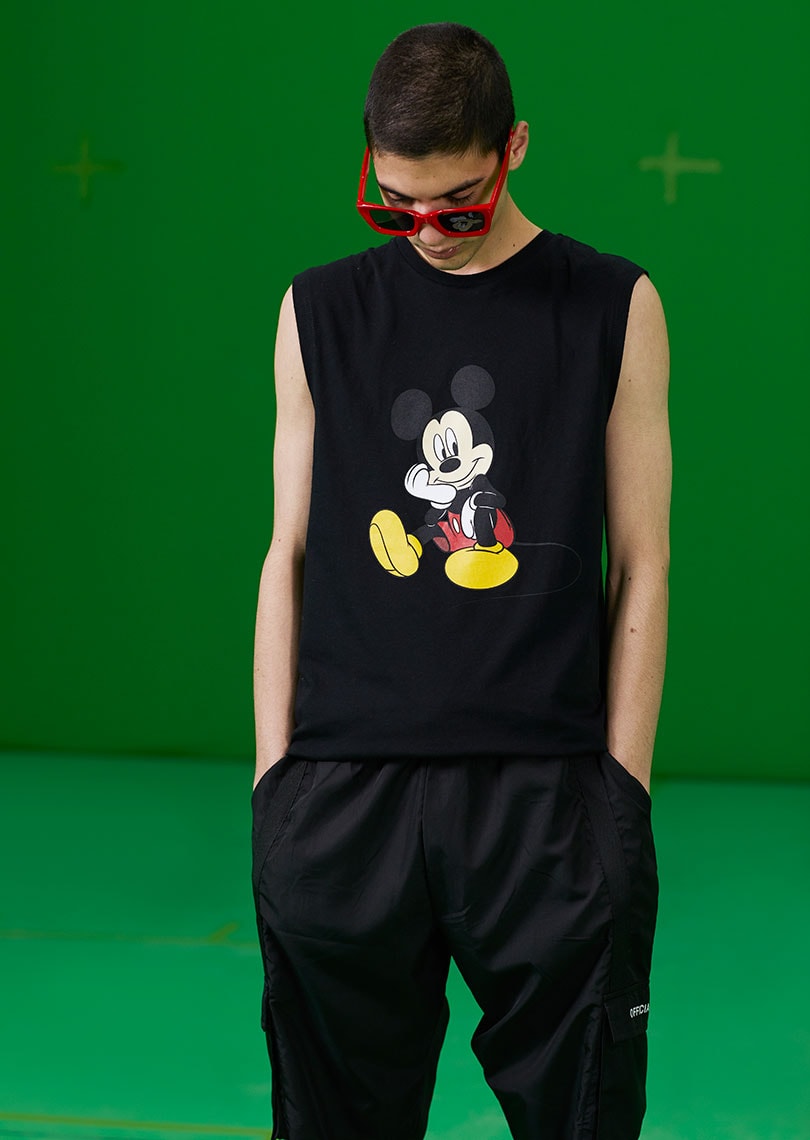 Other items in the collaboration include various Mickey T-shirts and tank tops, swim shorts, sliders, bucket hat, embroidered sports socks, and a tracksuit with shorts.