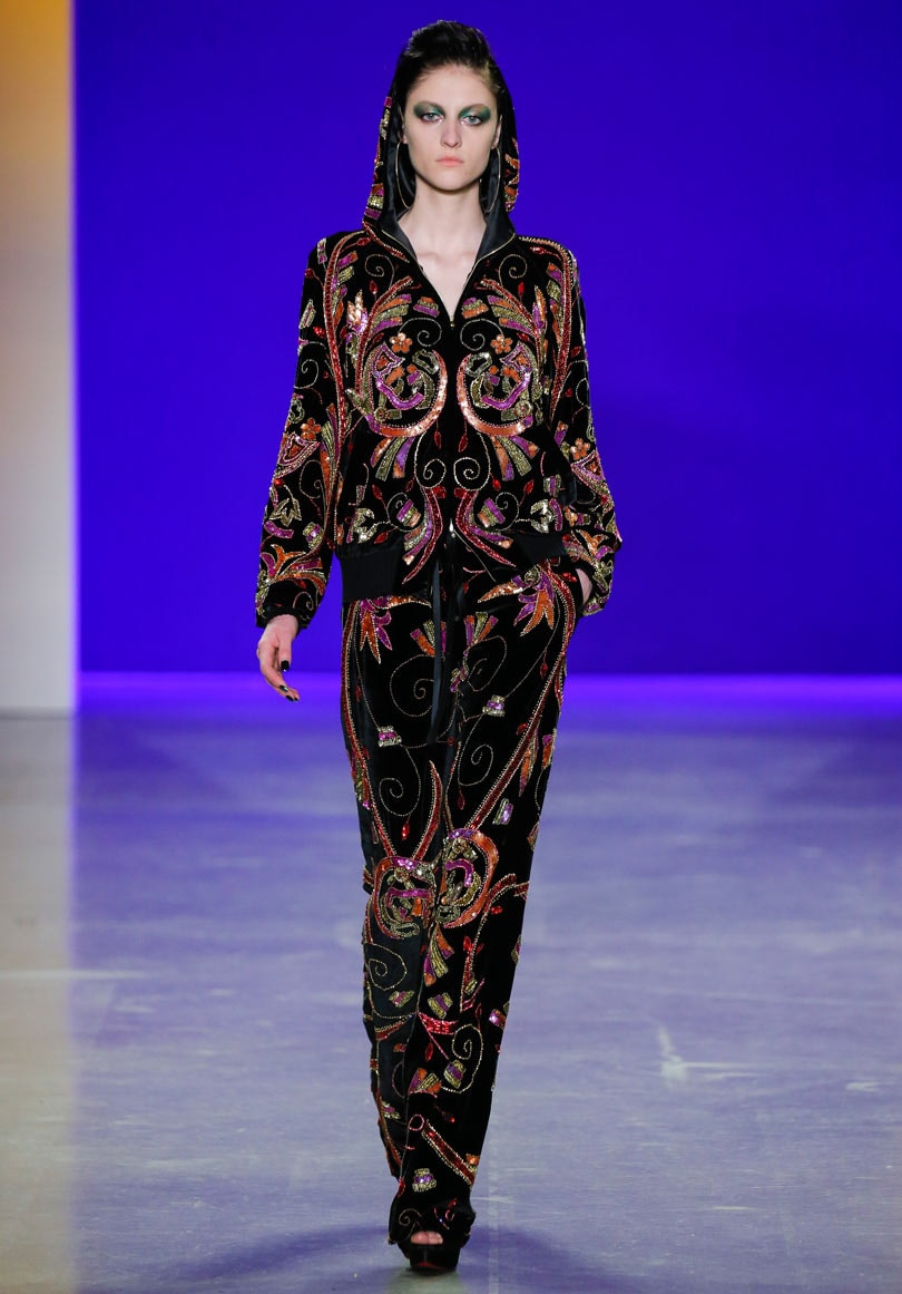 The finale look was a black velvet jumpsuit embellished with the face of the statue of liberty on the back in sequin crystal. It was an homage to the new liberty in fashion, and, just like America, Khan's collection was a melting pot of different ideas.
