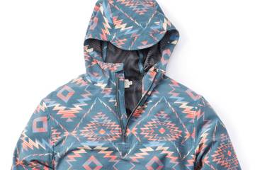 Priced at 248 dollars, the styling is based on late 70s/early-80s outdoor technical clothing, with a pattern layout that is a mix of Southwestern saltillo, overlaid with a primitive Navajo-style motif. It's not your average poncho though, but, rather, done with Faherty's signature swim fabric, which was no easy picnic for Mike to create.
